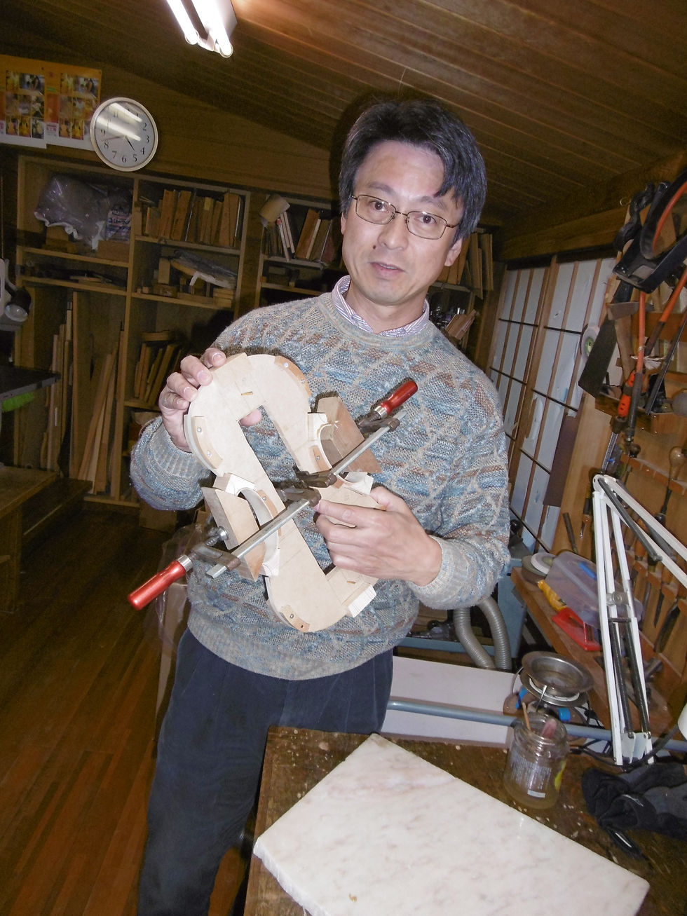 氏、着々と進行している。C字の曲げ加工もうまくまとめ、セッテイングする。膠をつけ蝦蛄マンできっちり止める。うまく曲がるか?折れないか?VN制作で最初に失敗する部分であるが氏うまく仕上げてこのドヤ顔である。 ベッツのいわれについてものの本に、こう書いてある。ヴィオッティーに習ったアーサー・ベッツは、オールドジョン(アーサーベッツの兄)の店で、店に来た無愛想でみすぼらしい男がたったの21シリング(?¥)でこれを売るという、アーサー、渡りに船とさっそく買い取ったという。このヴァイオリンは現在、ワシントンD・C の国会図書館にパーマネントコレクトされ 、現在では?十億でも買えないとある。
