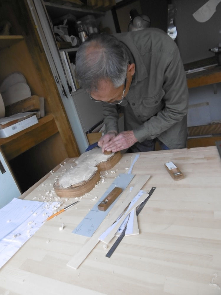 地板のアンジュレーション決めである。1枚板のため、低音部分側が25mmと厚いカンナで削るには、きつい。しかし、地道にじっくり削る根性が必要である。80翁二人並んでヴァイオリン創り、この趣味は最高の藝術である。当工房のモットー、創って弾くを実践してもらいたい。