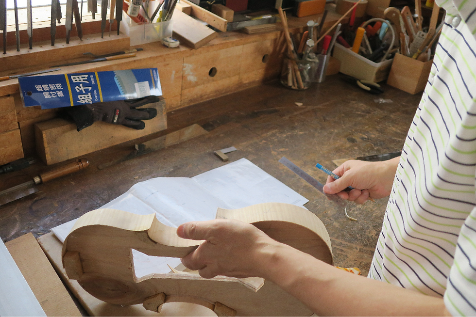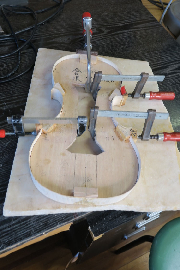 倉沢さん、順調に進んでいる。先週モールドに側板をつけたが膠が緩かったかはがれた。補修してから大体の平面を出す。さらに天板の”ハギ”前半の難しい仕事をいとも簡単にこなす。はたがねでがっちり止める。順調にライニングのカットまで一気に進んだ・・・。