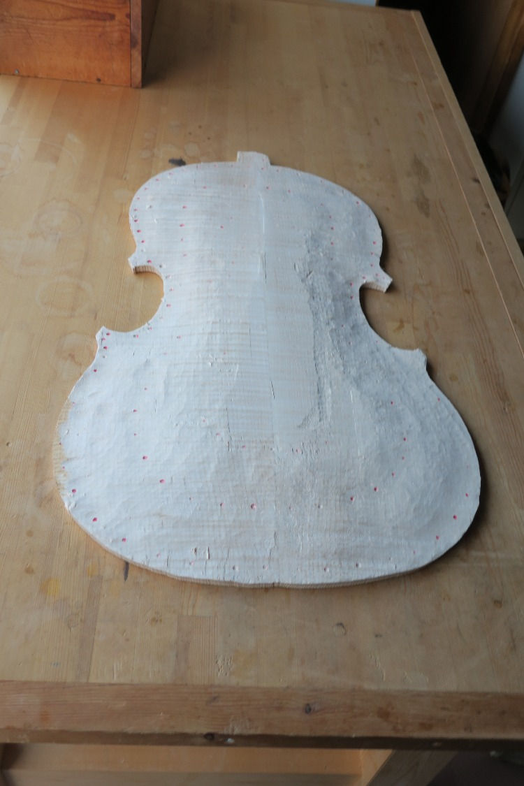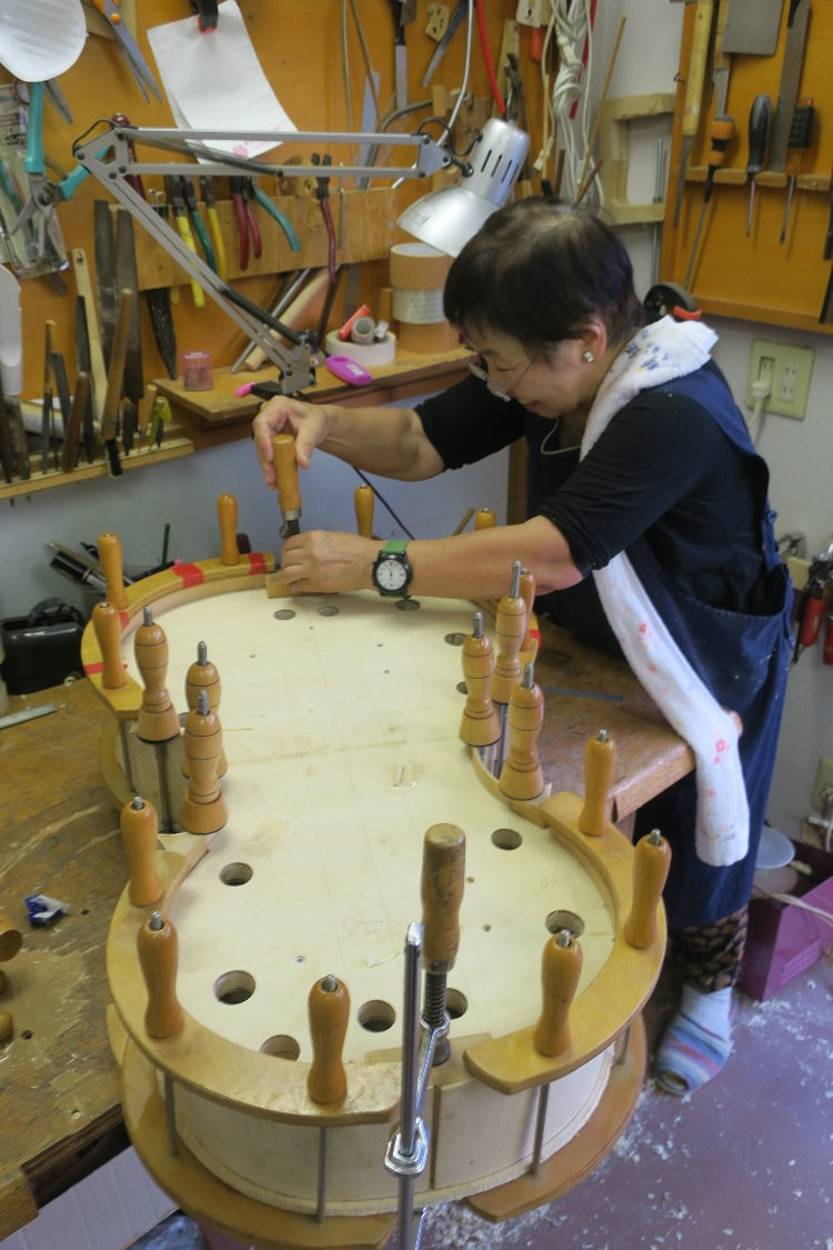 篠田さん、驚異的なスピードで進行している。ラフに仕上がった地板をモールドに固定する。サラに仕上げた天板のエッジをパーフリング用に平らにして、天地を閉じる。驚異的なスピードである。