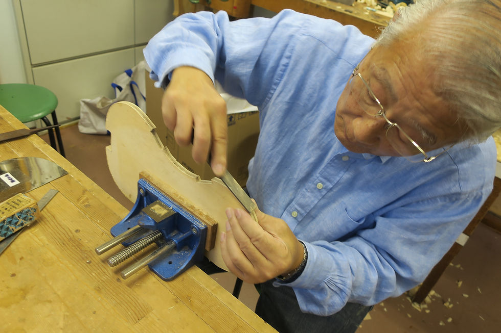 氏、久しぶりの登場である。ダヴィドフ完成後、最近湘南のオーケストラに所属し、ベートーヴェン”田園”を弾いてるらしい。今回は幼少のみぎりにやっていた、ヴァイオリンを創るという事で、登場した!さっそくモールド創り1・5mmのシナべニアにトレースした、バンドソーで切り抜きモールドの完成である。ダヴィドフを11ヶ月で完成させた人。6ヶ月で仕上げると意気込んでいる・・。