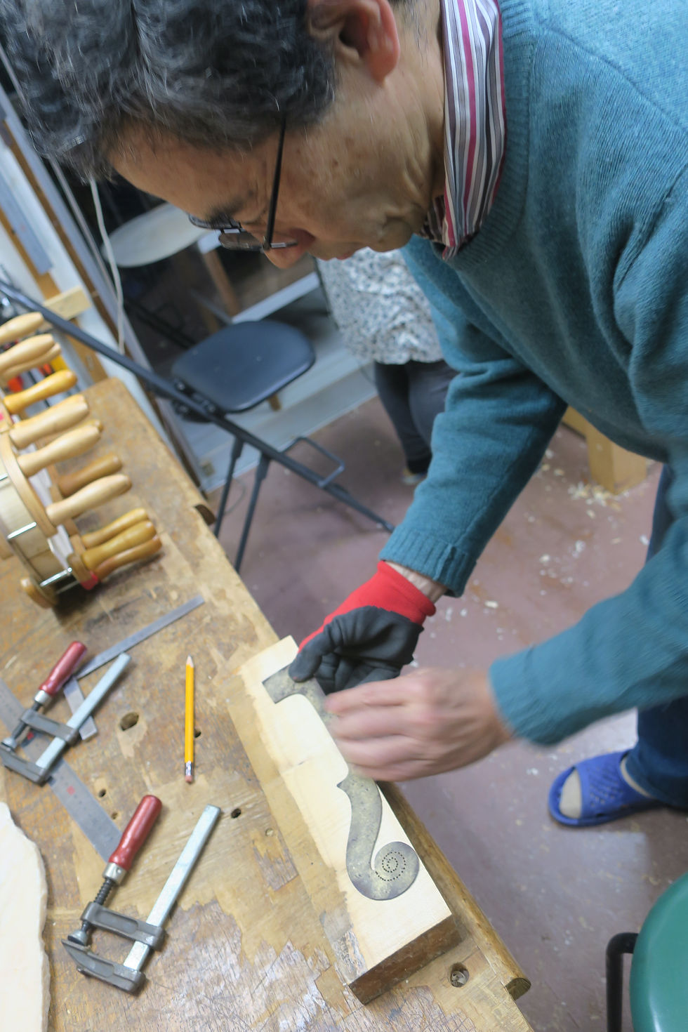 もともとヴァイオリニストであった、倉沢さん、現在オケではチェロを弾いている。ボディを上下貼付、いよいよネック制作に入る。メープル材を左右、天地、平面、平行をだし。ネックの型からトレース。いよいよ切り出しとなったところで、“バチッツ”嫌な音が響いた。バンド・ソーが切れた。今日はここまでとなった?!