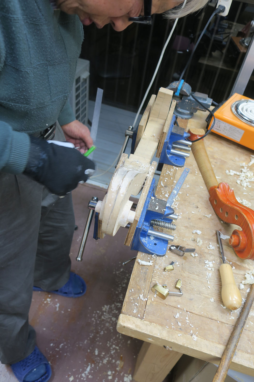 菊池さんネックの調整を図る。ダヴィドフのヘッドは小さめ、ボール盤であけたガイド・ホールをのみで掘る。裏側も小カンナで、削る、2月3日の展示会に間に合うか??