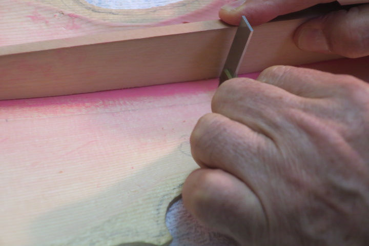 古川さん、バスバーの制作に入る。天板の端からバスバー材を取る。出来るだけ同種の材がいいという・・。天5mm-地7mm粗削る。さらにチョークを天板に塗り、擦り合せ、赤くついたところを小カンナで落とし、ぴったりフィッテイングさせる。氏、3台目の実績でいとも簡単にフィットさせた・・・。