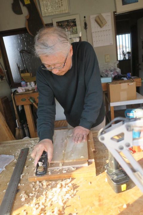 ニューヨーカーの娘さんに孫ができたという、お孫さんの顔を見にニューヨーク滞在2ヶ月、2月3日の展示会では制作したメシアでヴァイオリンを弾く。ベートーベンの”クロイツェル”を熱演、孫の顔に安心して。音楽、創作の世界に戻った・・?2台目のヴァイオリン制作はデルジェスの”IL・CANNON"の創作に没頭することとなった、地板の平面だしと切り抜き。手慣れたものであっという間に出来た!!