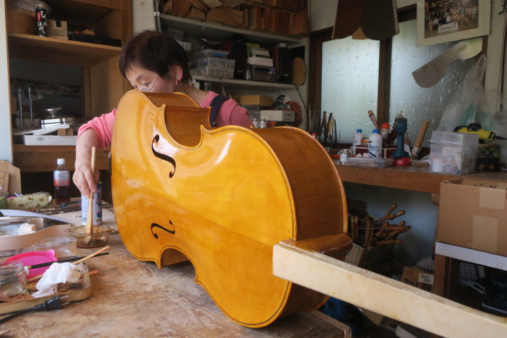 篠田さんのパワー。工房のみんなから尊敬されている朝から晩までたちっぱなし。前回まで6回塗っていた表面を600番の水ペーパーを使用しペーパーの重なり、汚れ、むらを丁寧に平らにする、すごいスタミナとパワーである。8-10回まで、アーバン・ブラウンに黒8滴を加え丁寧に塗る・・・・。だんだん琥珀からブラウンに変わっていく・・・。