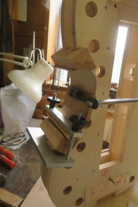 ゾノさん、2台目の”ビューティー”大変な気合を入れて創っている。一分の隙なく、挑む・・・。実際に膠をつけ楔形の固定具で仕上げるこれが一番手っ取り早い?おやー?膠をはがしてます。そうは問屋が卸さない・・・。今度は片方ずつ固定具をつけどうやらうまくいったようです・・・?見事完成か?やはりヴァーティカルが出ておらずまたまた外す。生徒に、チェロ・レッスンのためここまでとなる・・・・。