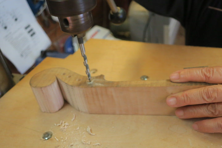 篠田嬢、とにかく仕事が早い。つられて小生もついつい早めに次の仕事を進める。しまった!早すぎた。地板を閉じてしまった。そういうやり方もあるとネックの切り出しにかかる、CASKO,高級ネック材で訳すと栗とある。柔らかめで仕事はしやすいが力に弱い・・。やった失敗!?3本目のネック材に変える。お嬢の右手が3を表している・・・。