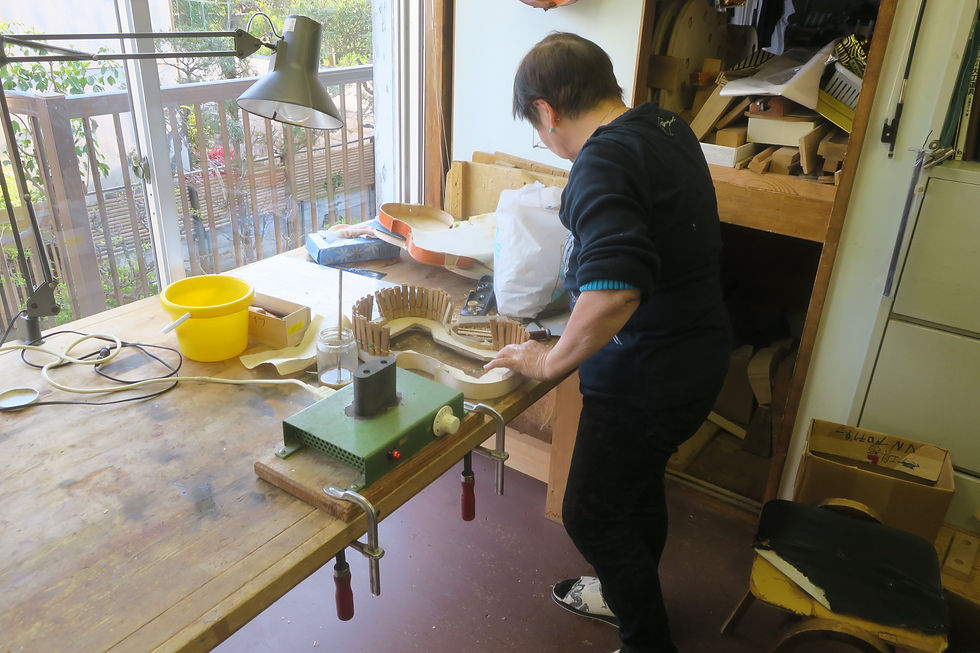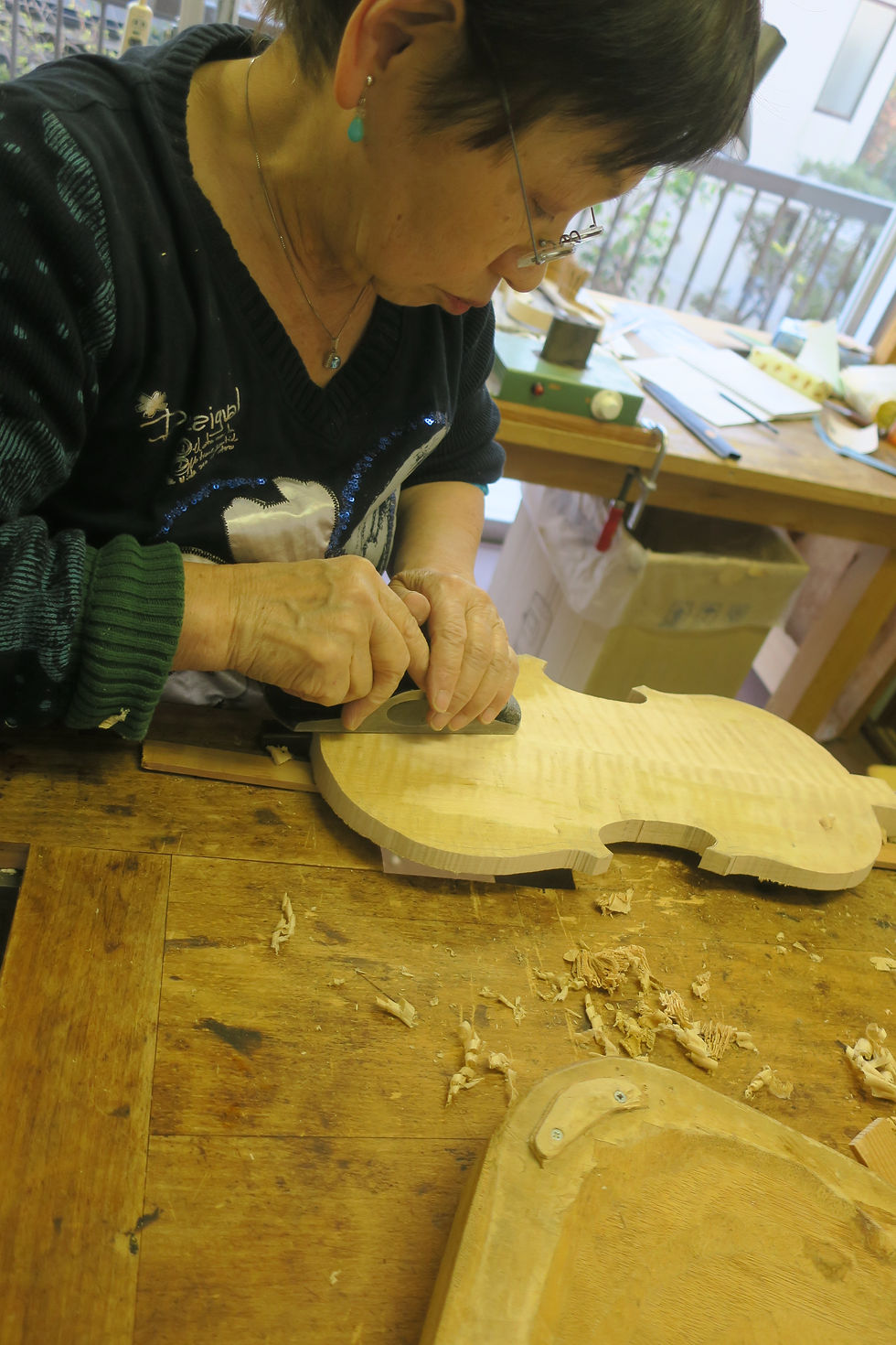 篠田さん、チェロ2台、ヴァイオリン2台目に挑戦だ!!とにかくヴァィタリテイーのある、お嬢である。ライニングを1・00mmX1・2mmに決め装着、地板のハギ、接着、さらにBETTS のかたちに切り抜く。裏側の平面だしと一気に進んだ・・・。