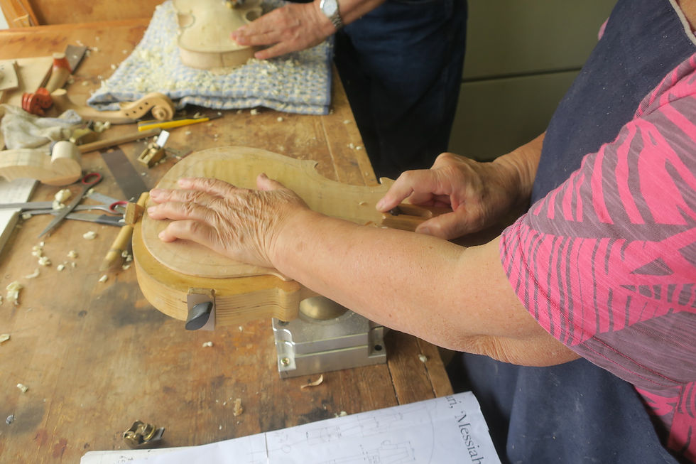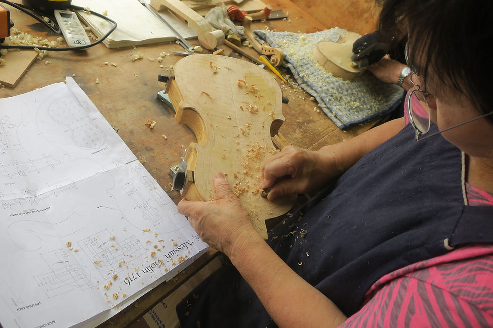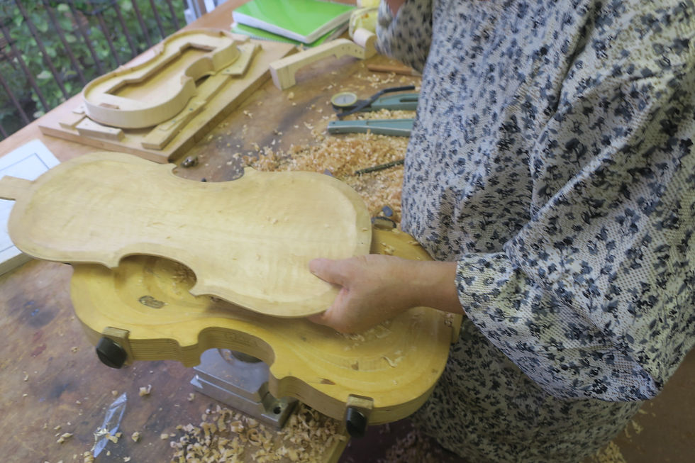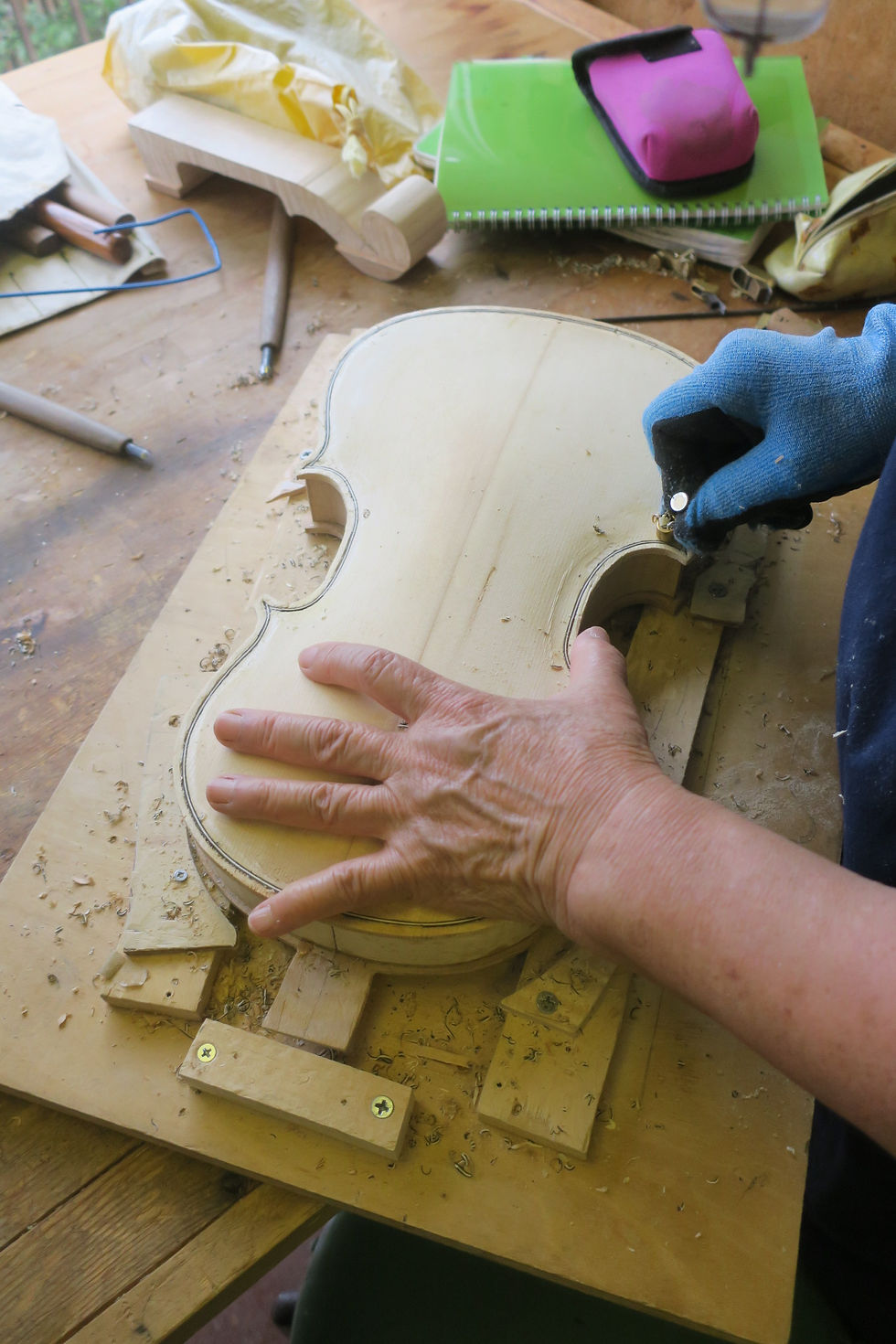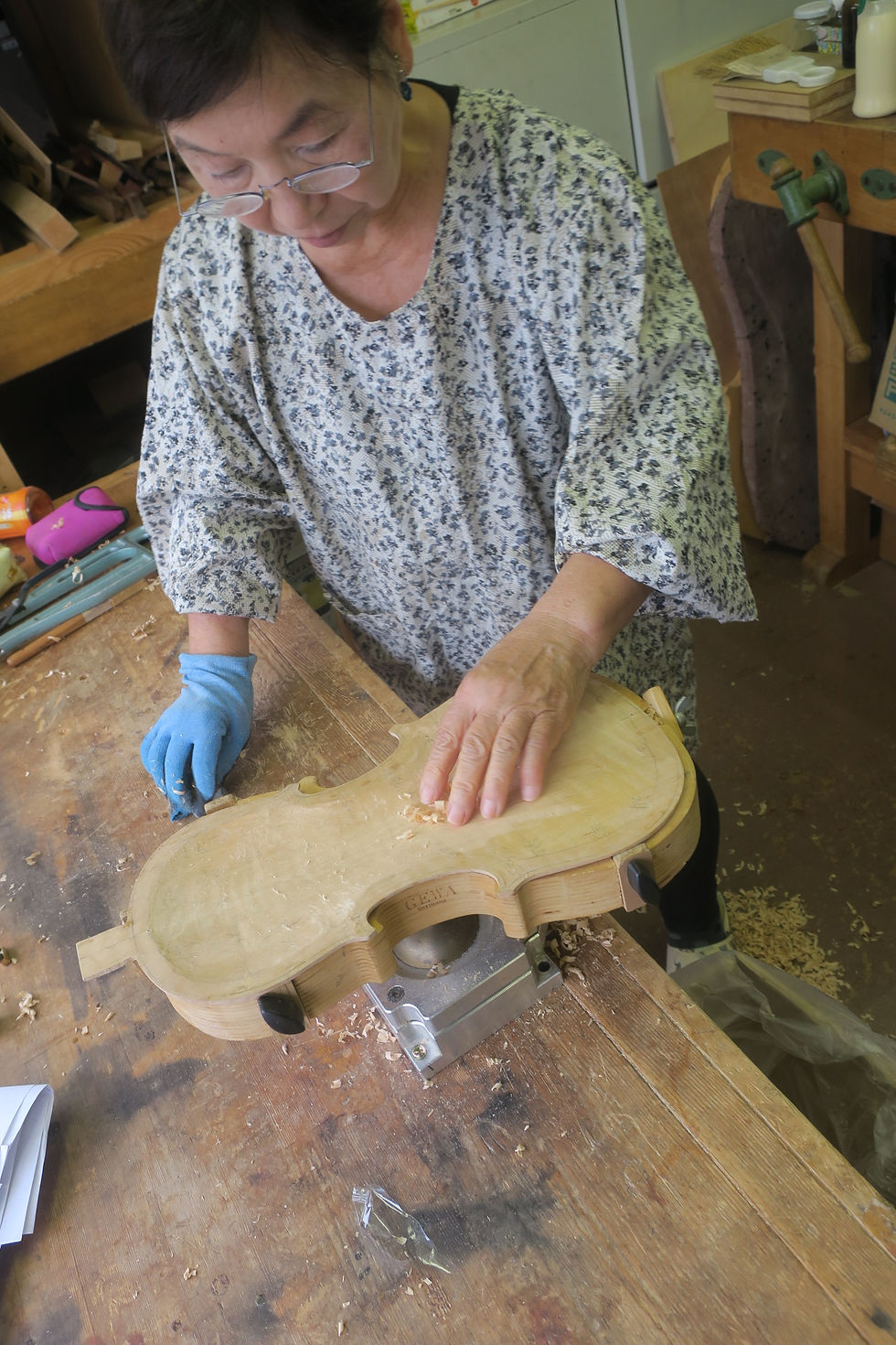篠田さんの趣味多彩である。ヴァイオリン制作、チェロ制作、水彩画、ピアノ演奏等々多彩な才能を持つ、パーフリングを終わり、天地板の仕上げにかかる。地板のパーフリング溝を正確に削る。この溝掘りがヴァイオリンのフォルムをきれいに見せる。さらに内側を設計図通りに掘っていく。ミリ単位の繊細な掘り込みを要求される、音の根幹である。