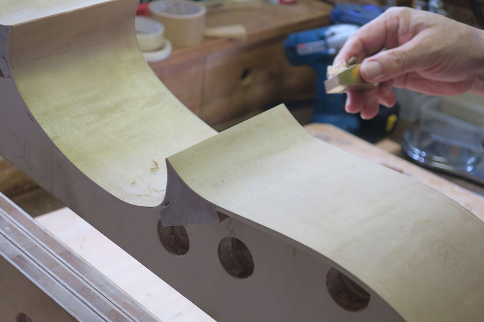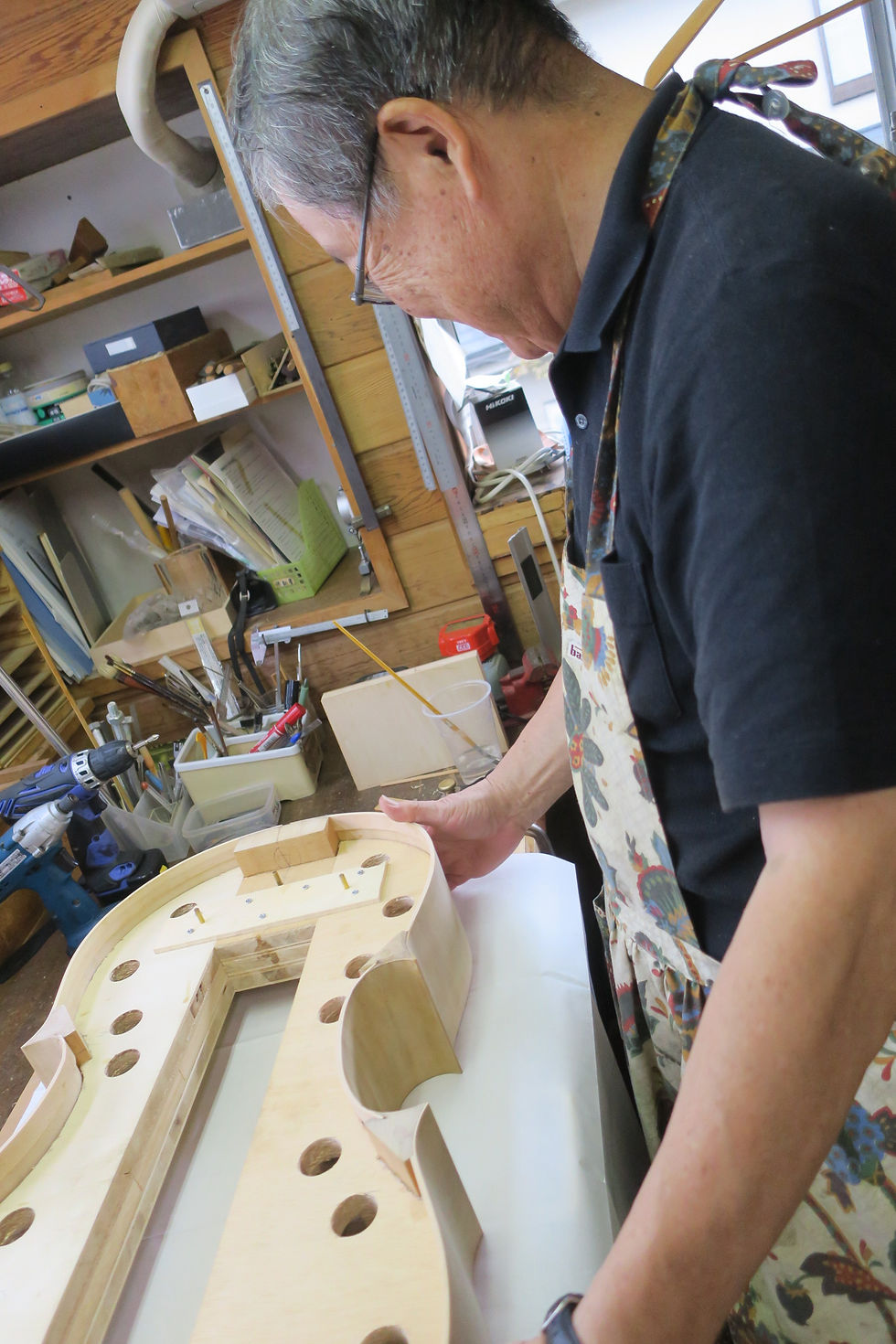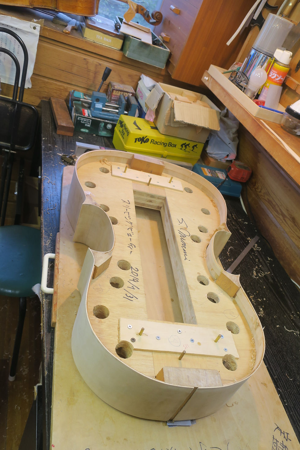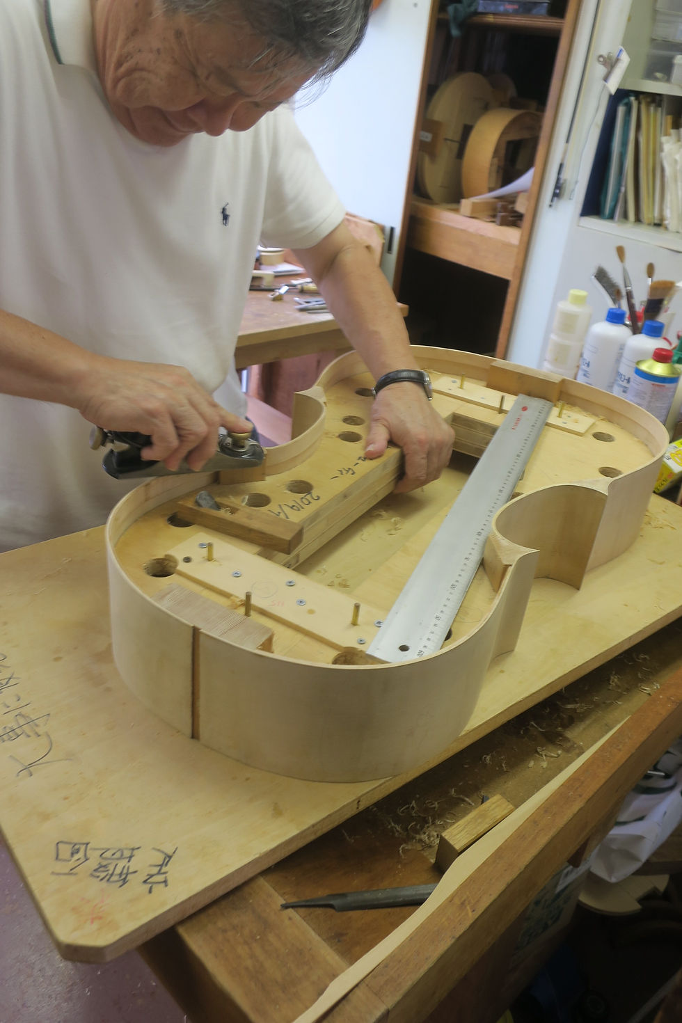 完璧主義の南さん、平面だし、C字バウツの垂直だし、時間をかける、この工程はいくら時間をかけても、正確を期さなければならない。10mmの下駄をアンダーバウツに敷き、コンパスで115mmのラインを引く、その通りにカンナで削り、トップとアンダに5mmほどの差をつける。奥さんからもらった洋裁用のペーパーを使い表面の高さ表を創る…。