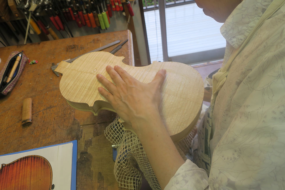 武江さん、じっくり制作に挑む・・。パーフリングを入れるため、周囲のがたを取り、全体出幅、2・25mmに統一する。時間をかけた分、美しいシルエットになった。いよいよ難しいパーフリング入れ込みになる。