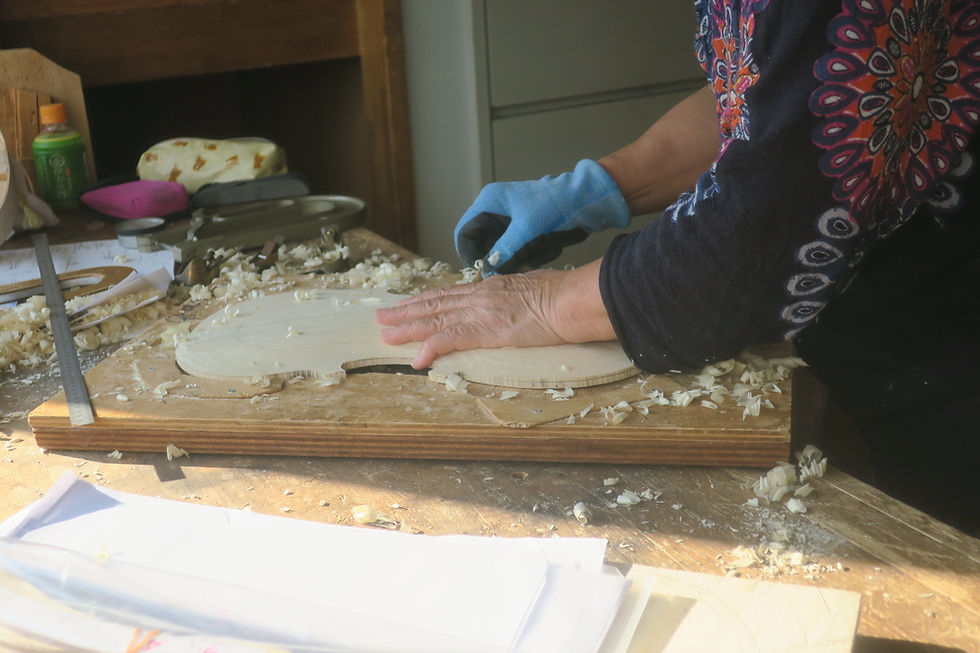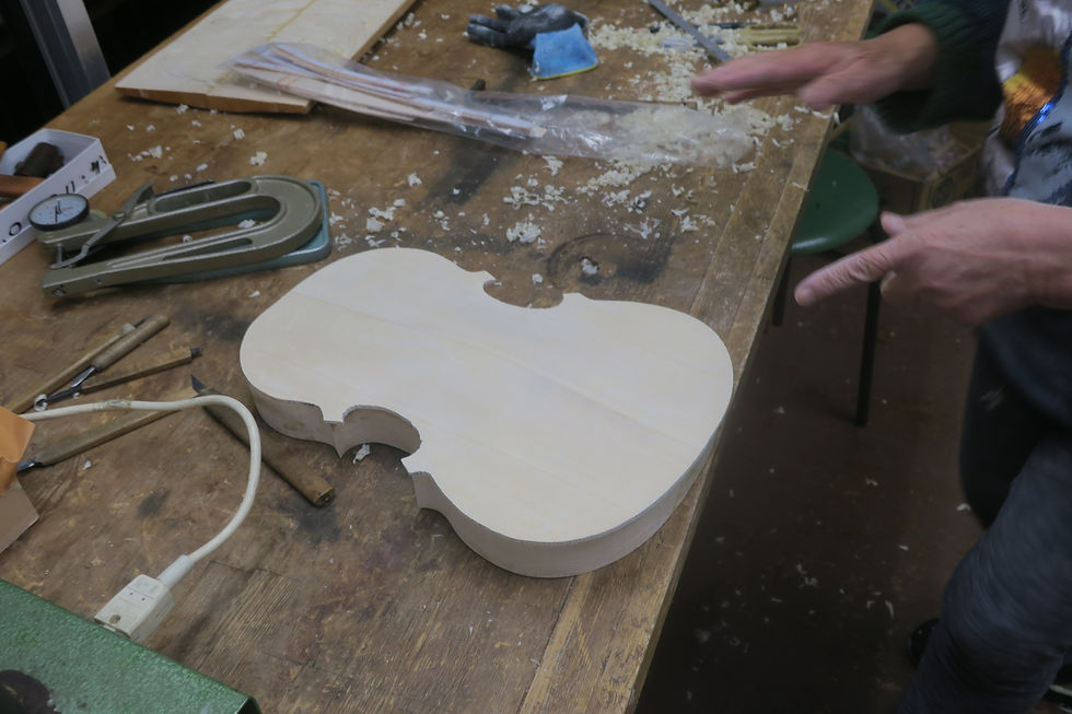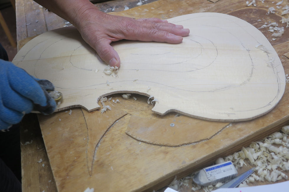 篠田さん、毎回驚くべき、結果を生み出す。天板の削りあっという間に出来上がる。等高ラインも左右均等を出す。ボディに貼りあっという間に完了した。
