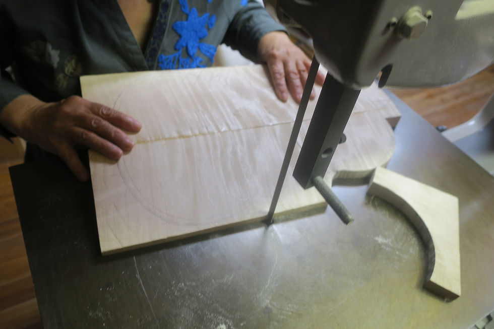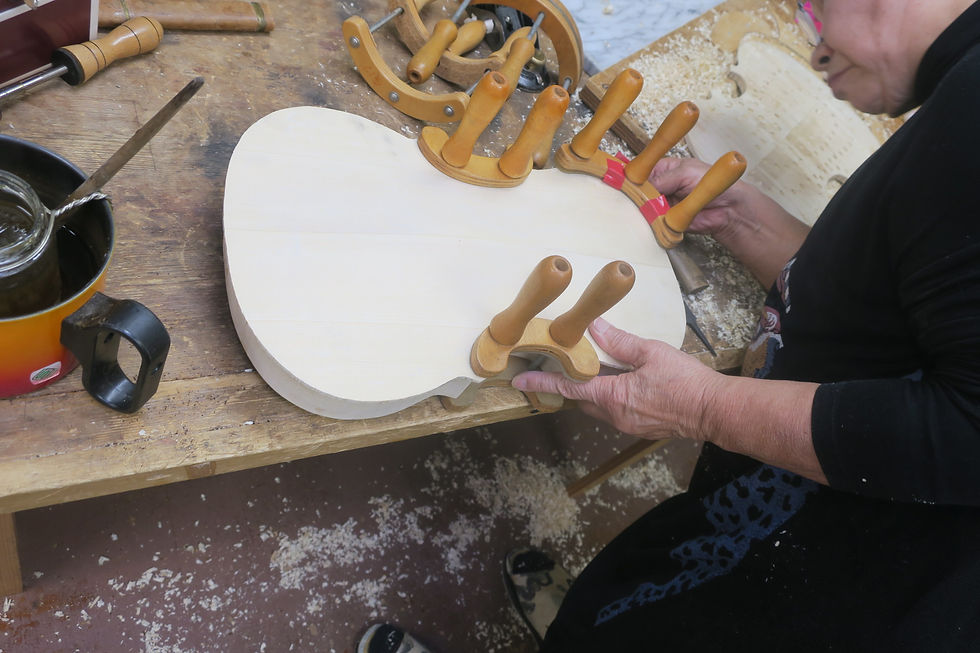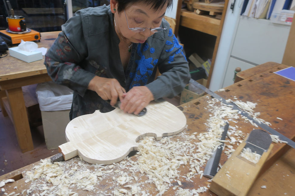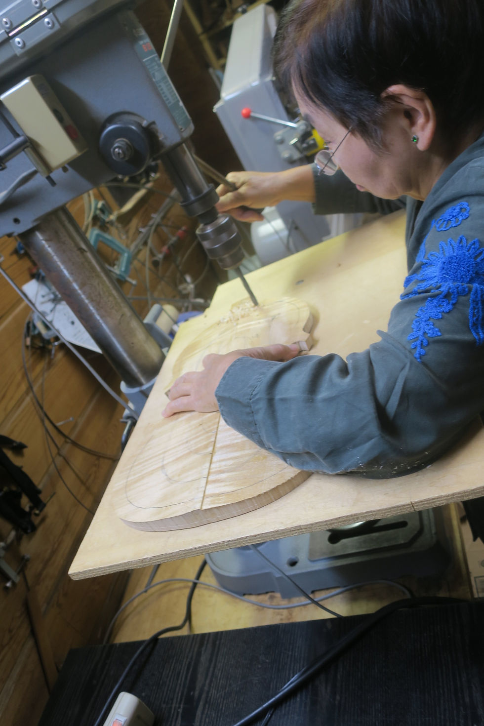 オールマイテイーのお嬢、素晴らしいスピードと正確性でガスパロのヴィオラを創っている。天板を完璧に仕上、地板の切り出し、ボール盤で厚み等高をだし小カンナで切削する。あっという間に仕上がった。さらに、上下の板をクランプで止め合わせ、パーフリングに向け準備万端・・・・。