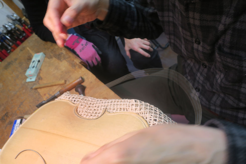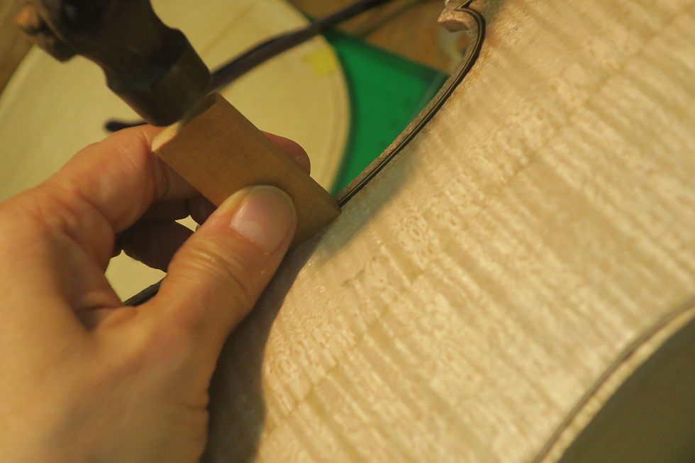 ターヘー楽団のコンマス武江さん、すごい慎重派、石橋をたたきながら、進行している。弦楽器制作はこの慎重さが大事である。地板はパーフリング完成。天板のパーフリングに挑む、じっくり掘り込み、C字コーナーの合わせを例によってじっくり進む、いよいよ見えてきた・・・。
