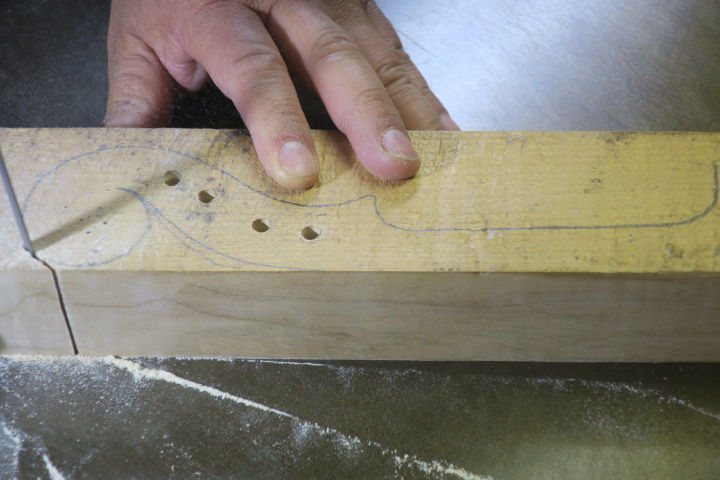 ネックのバックを美しく成型。のこ、ナイフ、やすりで仕上げを創る。来週から、いよいよニス塗り、黒を基調にするという。たのしみだ!!