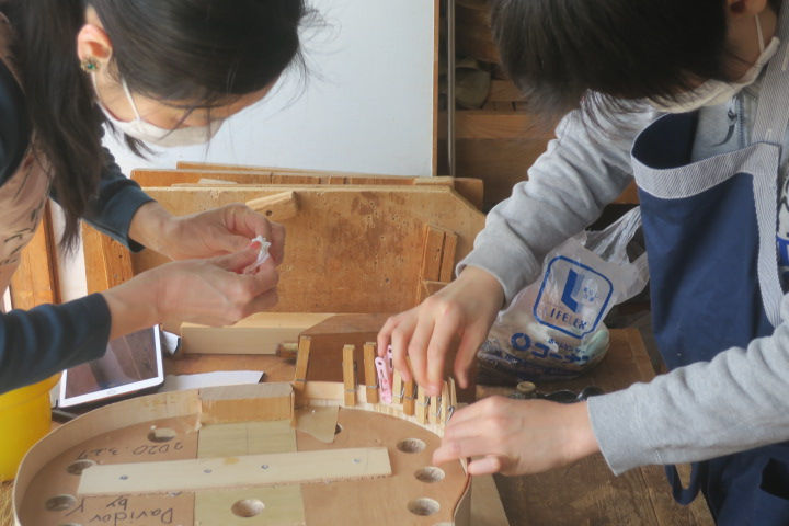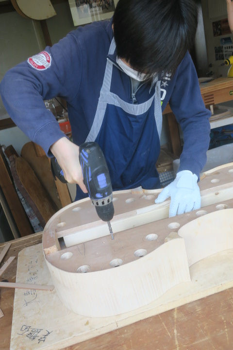 母子鷹で、母さんの大協力で着々と進んでいる。サイド板を完璧に終えた。続いて地板のライニングの制作取付である。これもあっという間に仕上げた。母さんの手伝い大である。今度は、表板のライニングに挑む、地板の経験で天板のモールドを外し、簡単に表のライニングを装着。あっという間に完了、母さんの手伝いがいかに大きいか母さんありがとうである・・・。