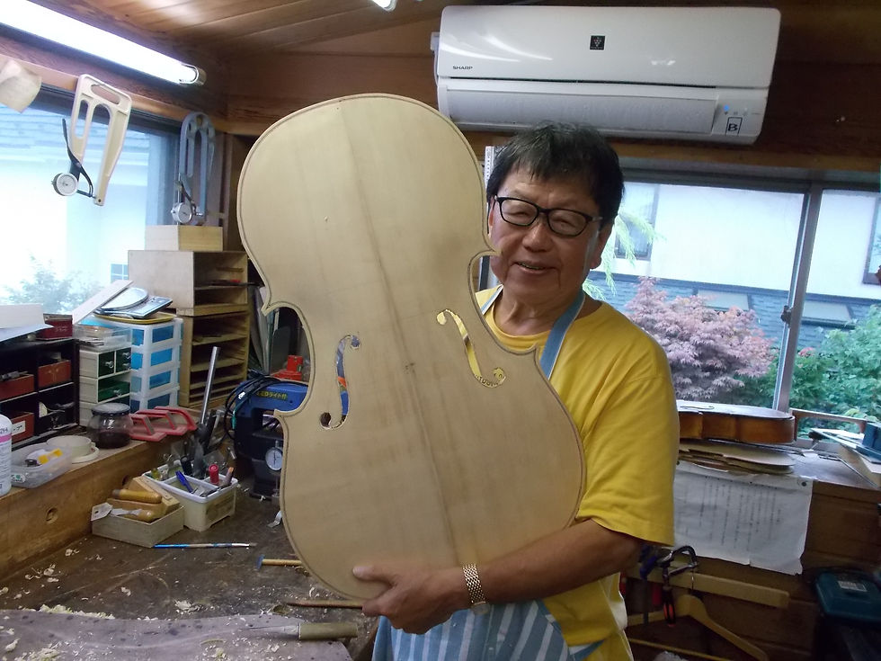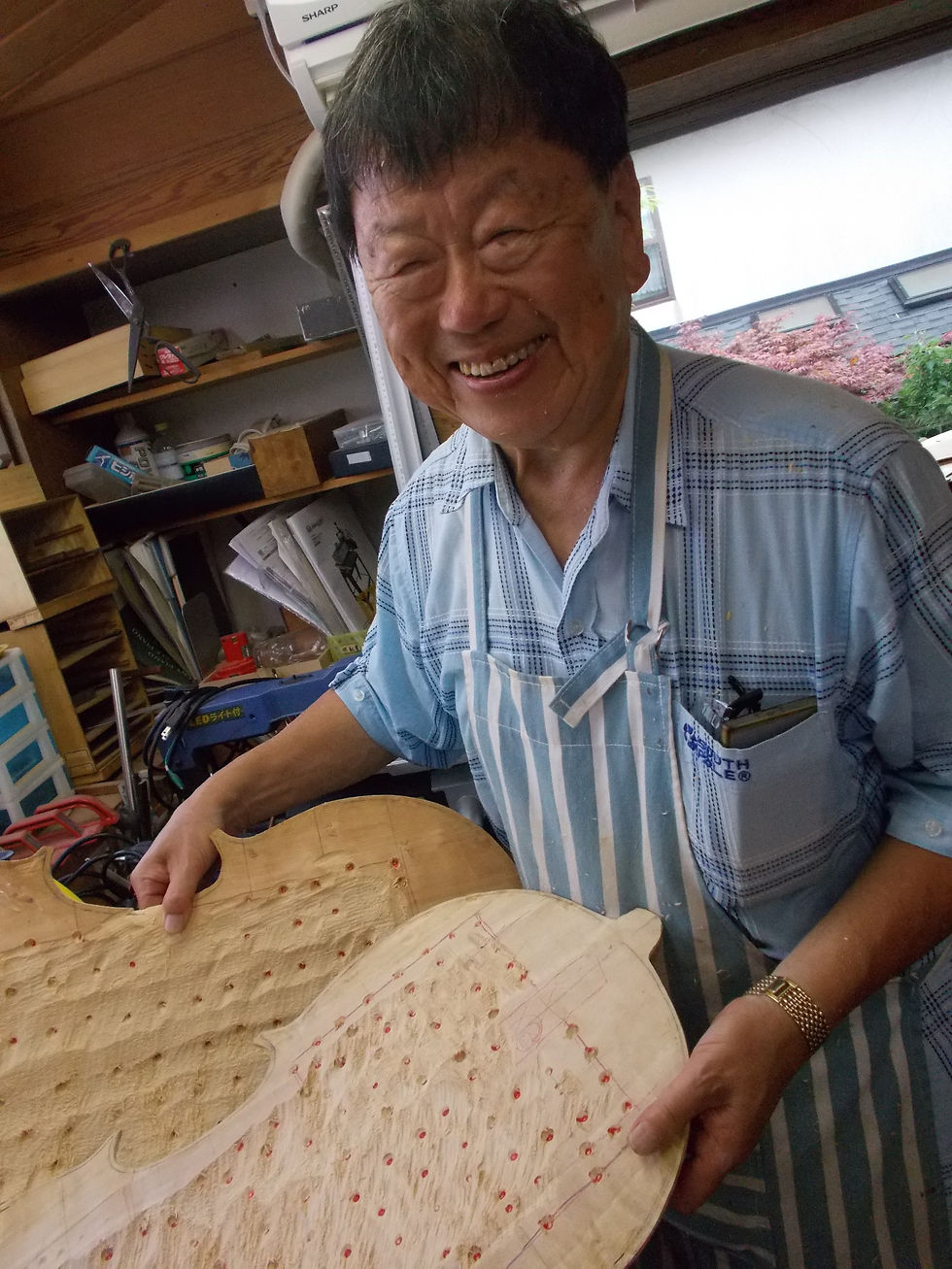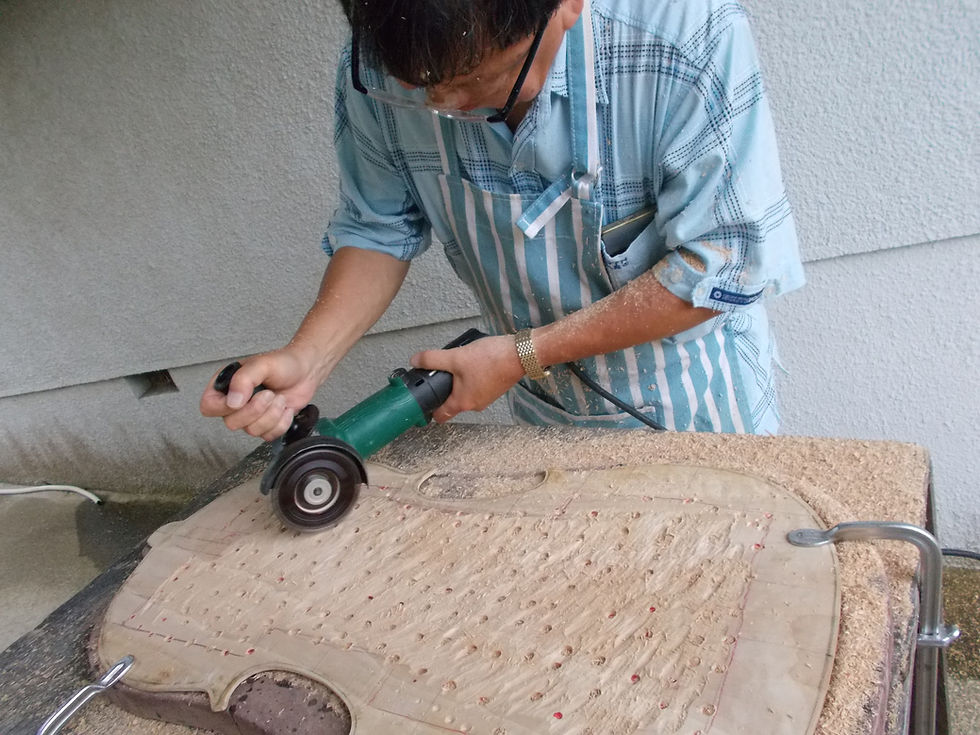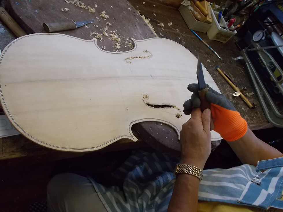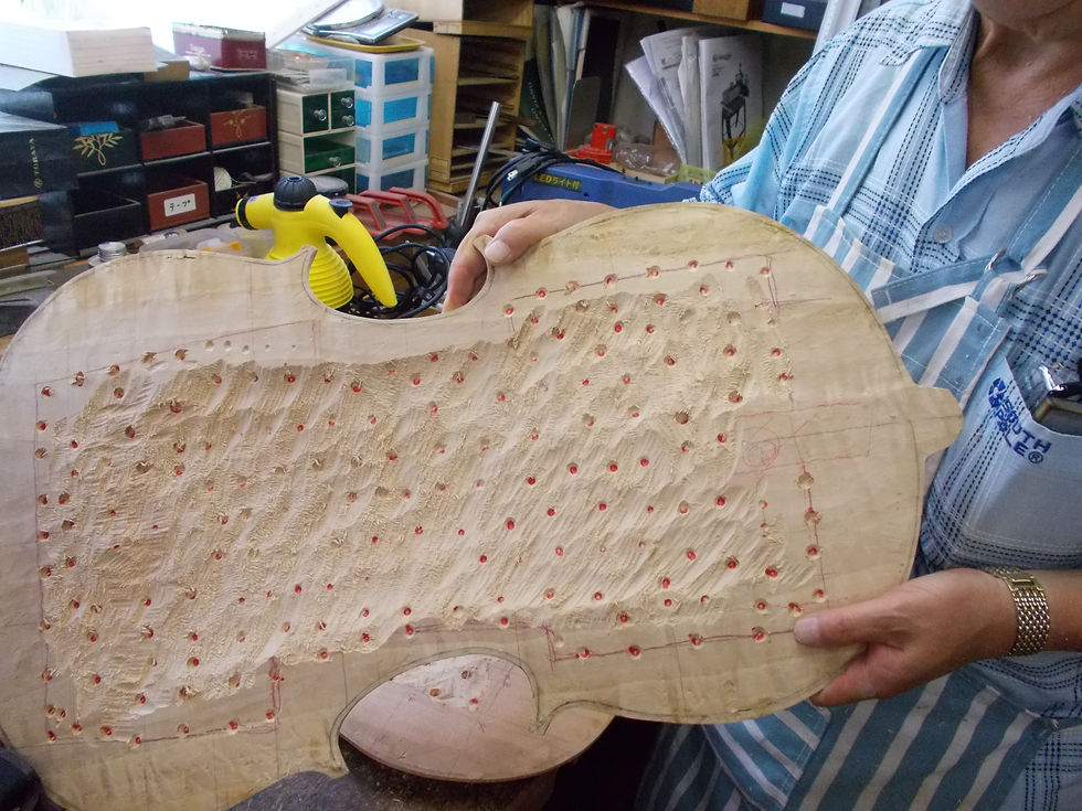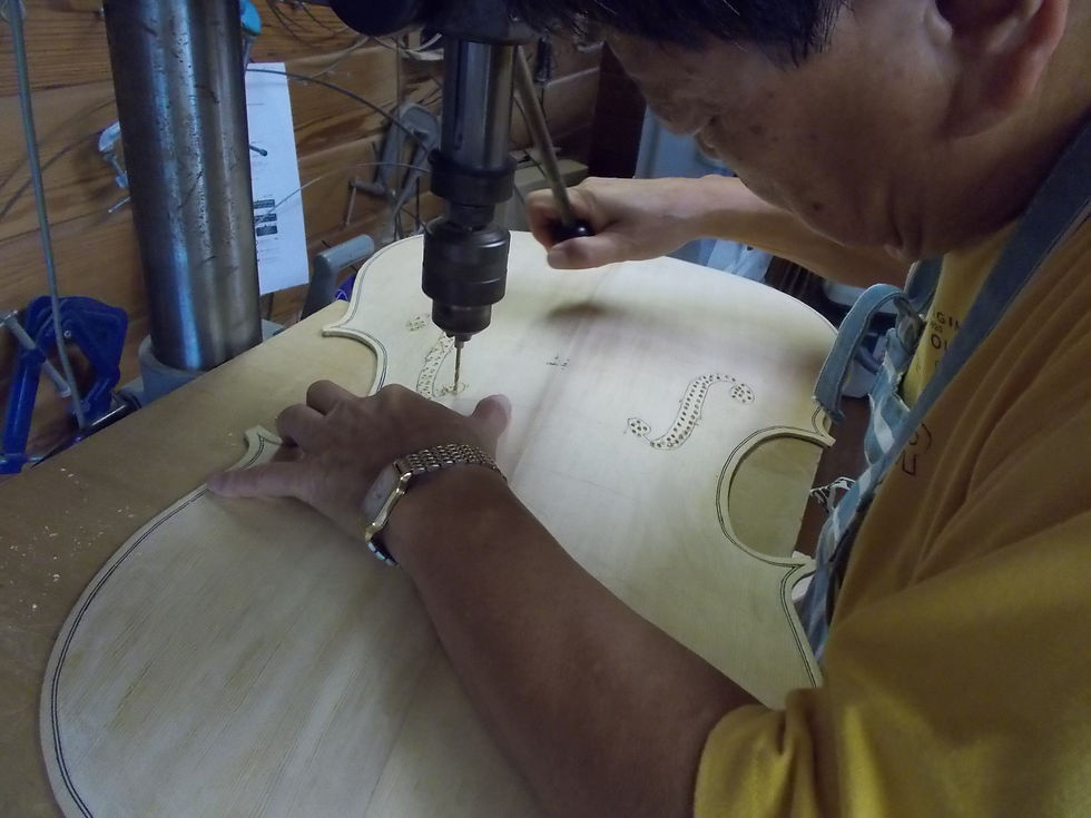 ゾノさん、いよいよおお詰めに近付いてきた。えぐりカッターを使い、あっという間に上下板の内側を仕上げた。ボール盤でF字孔のガイドを掘り、ナイフで美しくF字孔の完成である。