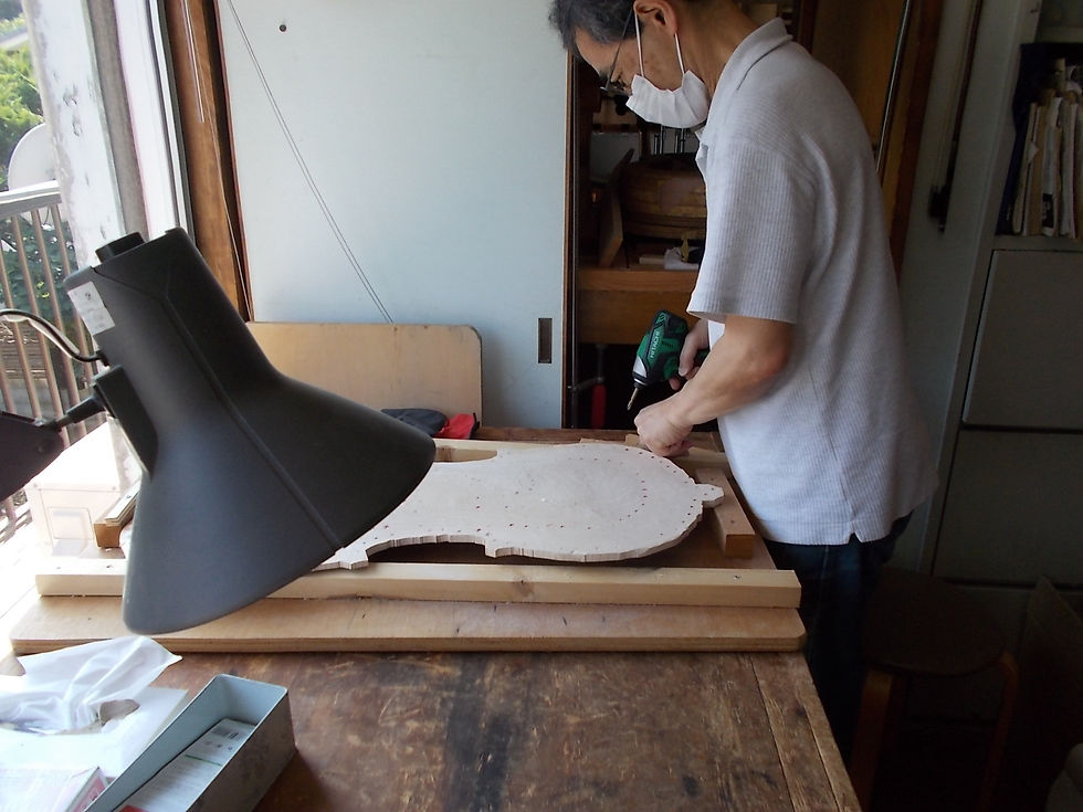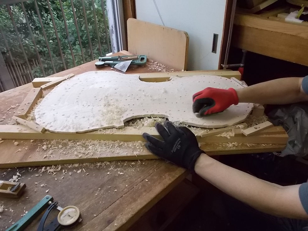 2台目のチェロ制作である。地板は約70mmの厚み、1枚板バーズアイメープルである。なかなかない素材である。先生嬉々として、この素材をノミ、カンナで支配している。人柄が現れる・・・。